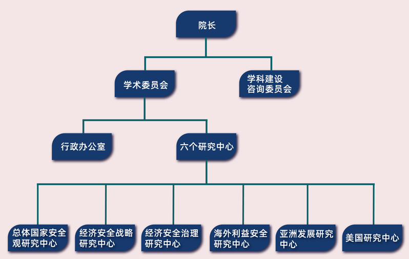 研究院实行院长负责制,由校党委书记担任院长,设学术委员会和学科建设咨询委员会作为学术指导和顾问机构,下设一个行政办公室和六个研究中心:总体国家安全观研究中心、经济安全战略研究中心、经济安全治理研究中心、海外利益安全研究中心、亚洲发展研究中心、美国研究中心。