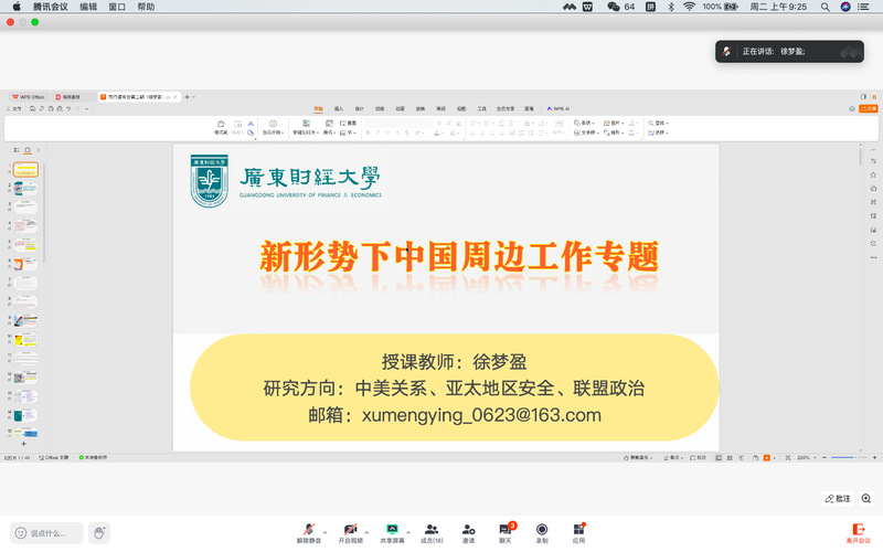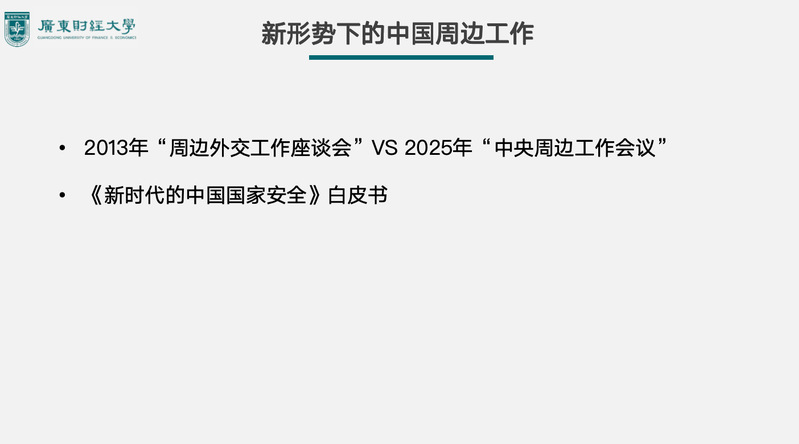 为深入推进国家安全学学科建设,加强研究生教育培养,7月29日上午,国家安全与发展研究院第二期“笃行”读书会顺利举行(线上会议)。本次读书会由国家安全与发展研究院专任教师徐梦盈博士分析讲解“新形势下中国周边工作专题”。国家安全与发展研究院博士生导师邓世豹教授、崔婷副院长、杨继君教授、专任教师张展培博士、郭卫东博士、杨飞博士以及2024级和2025级硕士研究生和2025级博士研究生参加读书会。