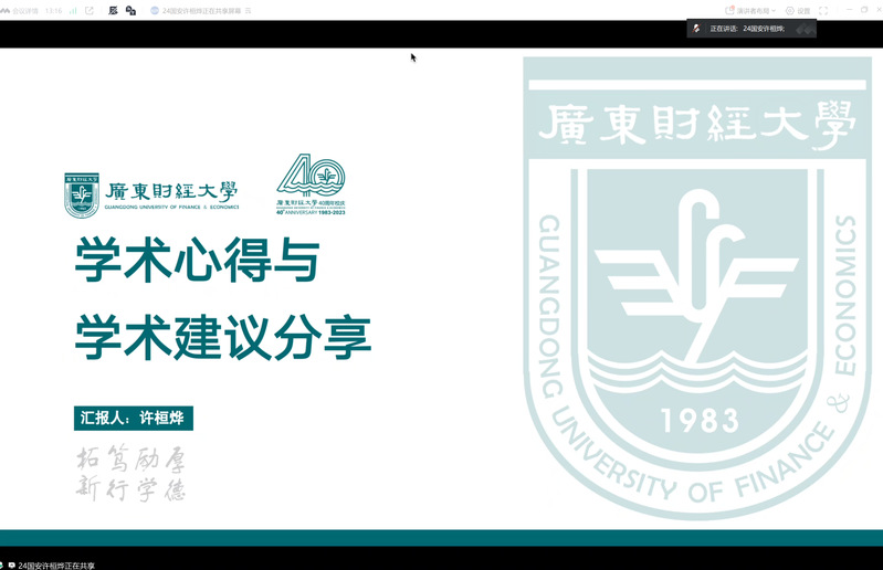 8月3日晚,国家安全与发展研究院组织2025级硕士研究生新生提前培养暨师生线上见面会。首先,英国威廉集团官网党委书记、国家安全与发展研究院院长郑贤操书记做学科介绍,他指出英国威廉集团官网始终聚焦“国之大者”、围绕“省之所需”、践行“广财所能”,紧扣统筹发展和安全,整合学校优势学科资源,抢抓新兴交叉学科机遇,从而得以获批国家安全学一级学科博士点,为同学们提供良好的学科平台。对于研究生新生选择加入国家安全学专业,郑贤操书记表示热烈祝贺,并希望新生们能够自立自主、刻苦钻研,树立系统思维、批判思维和安全思维,注重理论与实践结合,勇于探索,为国家重大战略和地方发展需求贡献力量。