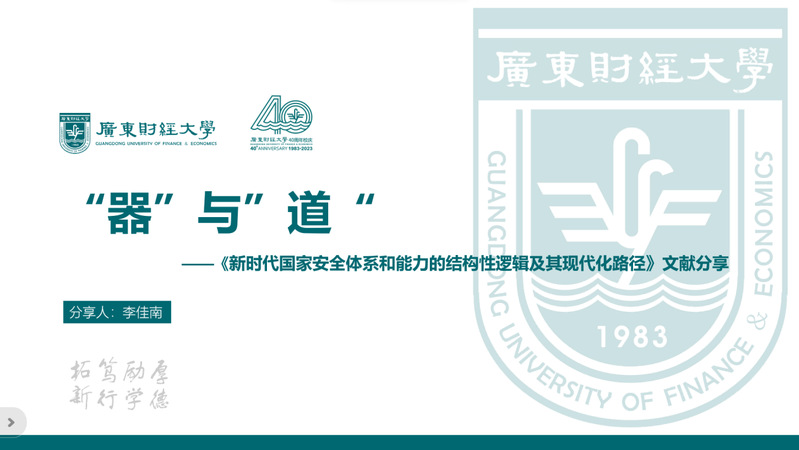 在学习分享环节,李佳南同学在对胡洪彬教授《新时代国家安全体系和能力的结构性逻辑及其现代化路径》一文的学习研讨中,从“破题、摘要、引言、内容、结论反思及补充阅读”六个方面对该文献进行了系统解读,并延伸探讨了国家安全学中“道”与“器”的关系,带给大家许多启发。吴燊同学从“作者背景、研究框架、演变历程、内在逻辑”等维度,对王妍妍与孙佰清教授《新时代国家安全体系和能力的结构性逻辑及其现代化路径》一文展开详细评述,并通过同类文献的比较分析,深化了对该研究主题的理解,拓宽了同学们的学术视野。